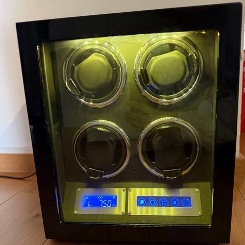 Pen watch winder i valnøtt selges. Kan styres vha radioknapp per sone (en innstilling oppe og en annen nede). Blått ledlys for økt kulhet 😊 Må være påkoblet strøm.