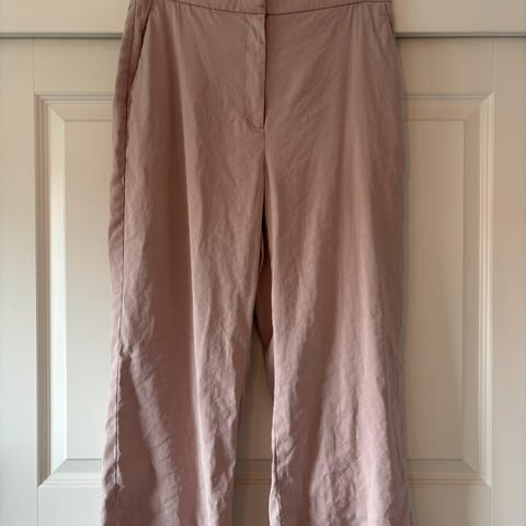Lys rosa bukse fra H&M i str 38. Straight fit med høy midje, glidelåslukking og skjult knapp- og krokfeste. Diagonale sidelommer, falske baklommer og rette ben med press foran og bak.