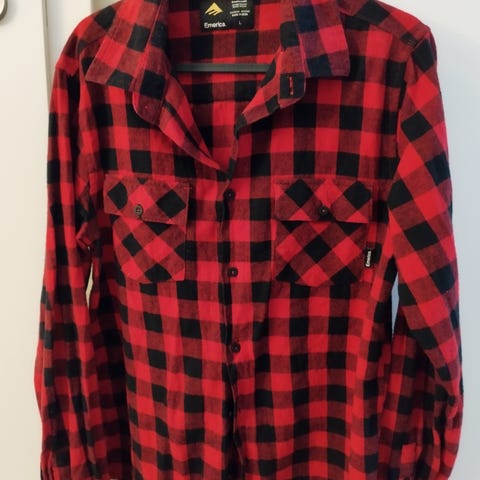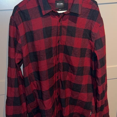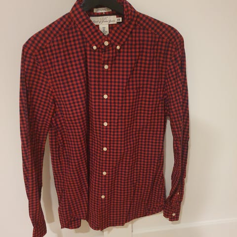 H&M skjorte for herre i størrelse M. Skjorten er rød med rutemønster og har lange ermer. Modellen har krage, knappelukking i front og brystlommer med klaff. Passer til hverdagsbruk og uformelle anledninger.