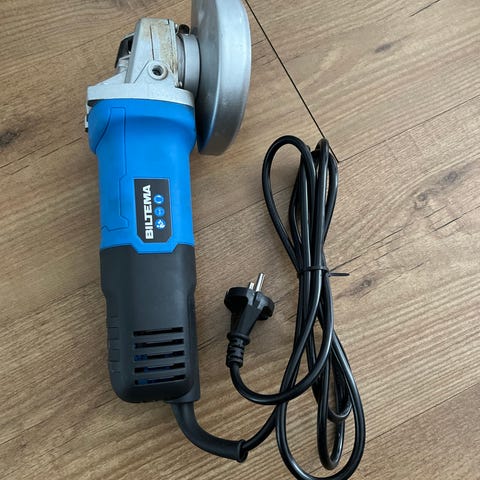 Elektrisk båndsliper. Maskinen har håndtak på toppen for tohåndsgrep og justeringsskrue på siden. Egnet til sliping og pussing av treverk og andre materialer med slipebånd. Strømtilkobling via kabel. Det følger med montert slipebånd på maskinen.