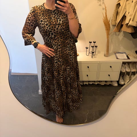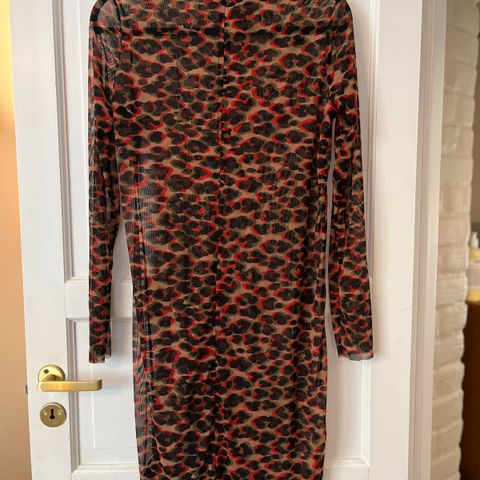 Samsøe Samsøe hverdagskjole for dame i størrelse M. Kjolen er brun med leopardmønster og har lange ermer. Materialet er polyester, som gir et lett og fallende uttrykk. Passer som hverdagskjole eller til andre anledninger der en mønstret kjole ønskes.