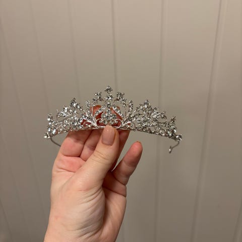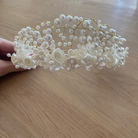 Kjøpte tiara/kronen i Vietnam for 1 år siden for ca 800kr. Kun brukt en gang i forbindelse med bryllup. Det går ann å justere posisjonen til steinene/stilkene. Den er elegant og minimalistisk. Bare sende mld hvis du lurer på noe 😊