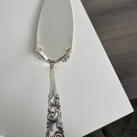 Kakespade i metall med dekorert håndtak.i 830S Spaden har tagget kant på den ene siden for enklere oppdeling av kaker og paier. Leveres i eske med mørk innside som holder kakespaden på plass. Egner seg til servering av kaker, paier og desserter ved borddekking og selskap.