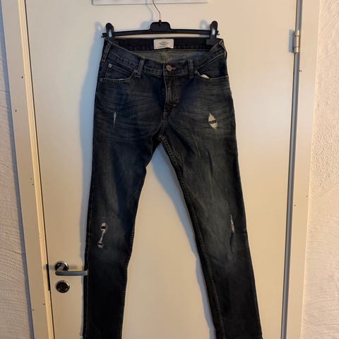 Klassisk 5-lommers modell med beltehemper og glidelås-/knappelukking.