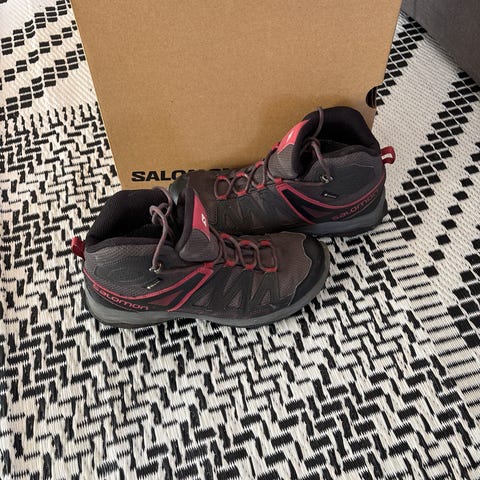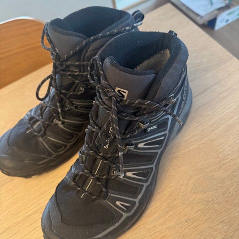 Veldig lite brukt Salomon tursko i størrelse 38. Høye tursko/støvler med snøring og kraftig yttersåle med grovt mønster. Fargekombinasjon svart med blå detaljer. Overdel i tekstil og syntetiske materialer med polstret ankelparti for støtte. Egnet som tur- og fritidsstøvler i variert terreng.