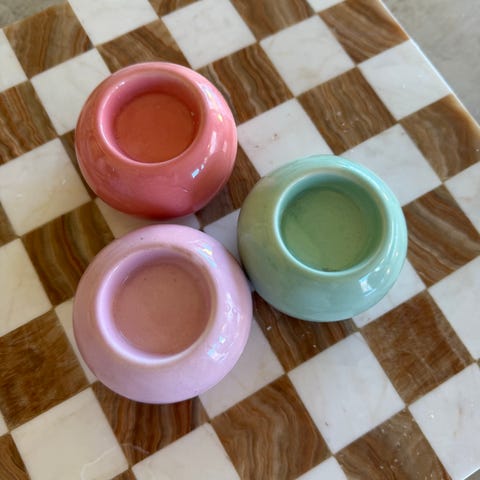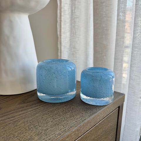 Rusta lysestaker 4 stk små i blå og 2 store blå og en stor rosa. Rund form med hul åpning til telys. Selges som sett med flere like og lignende varianter i samme stil. Egnet som borddekor eller vinduspynt innendørs. Hentes i Nydalen.