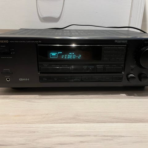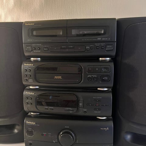 Aiwa musikkanlegg med cd-spiller, dobbel kassetspiller og fm-radio. Antenne og 2 høyttalere gis bort mot henting.