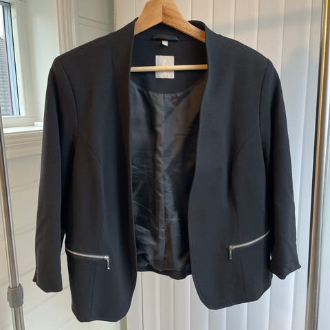 Svart blazer fra H&M i str 40. Detaljer med gullglidelås på lommer og ermer. Foret på innsiden, sitter veldig fint og gir en stram, tykk og eksklusiv look.