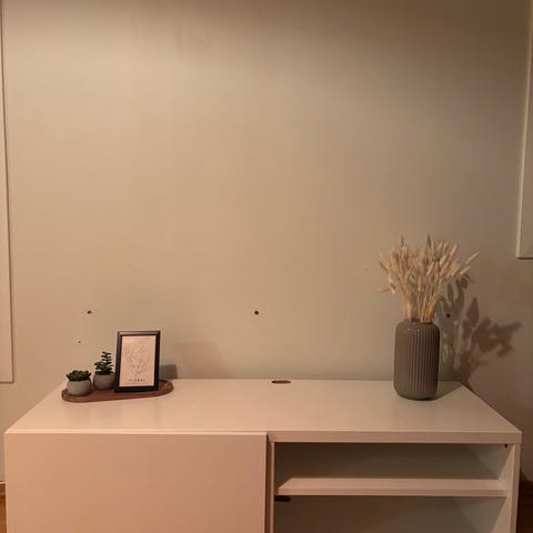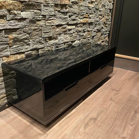 BESTÅ fra IKEA. Rammen er fargen brunsvart, men har sorte, glatte skuffer og glass på overflaten. Hull bak til å skjule ledninger fra TV.
