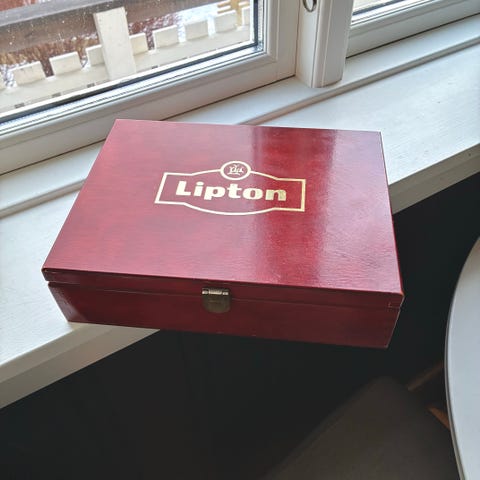 Twinings teboks i tre. Klassisk teboks med hengslet lokk og metall-lås i front. Innvendig inndeling i flere rom for teposer. Egnet til oppbevaring og organisering av ulike typer teposer på kjøkken, kontor eller serveringsområde. Eventuelt innhold av teposer kan variere eller være brukt opp, og boksen kan også brukes som oppbevaringsboks til andre småting.