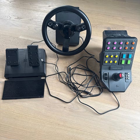 Praktisk ratt & pedal sett for diverse sim spill, fungerer på bl.a. Farming Simulator, Euro Truck, Train Simulator, Snowrunner, og Eilte Dangerous.