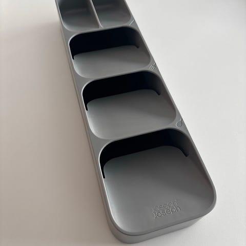Pent brukt bestikkoppbevaring fra Joseph Joseph i grått med sklisikre kotter under. Ingen bruksmerker, som ny. Plass til over 48 stk bestikkdeler.