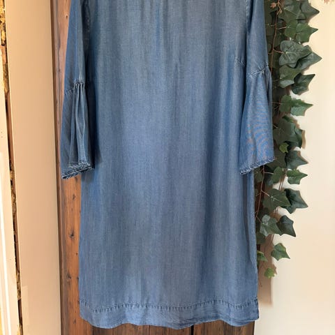 Pent brukt Katrin Uri hverdagskjole i denim i blå farge, størrelse 42 for dame. Kjolen har rund hals og trekvartlange ermer med volangkant. Skjørtet har rynket volang nederst, som gir et lett og avslappet uttrykk. Stoffet er mykt og ganske tynt, og faller pent. Det har en svak glans. Glidelås i ryggen for enkel av- og påkledning. Passer til hverdagsbruk og uformelle anledninger. Har dessverre blitt litt for liten for meg