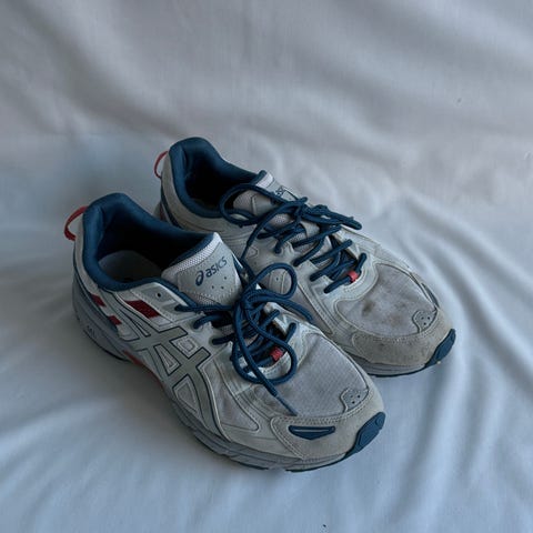 Asics sneakers joggesko i størrelse 44. Modellen er lave joggesko med snøring og perforert tåparti for ventilasjon. Skoene er i hvit farge med Asics-logo på tunge og hæl.