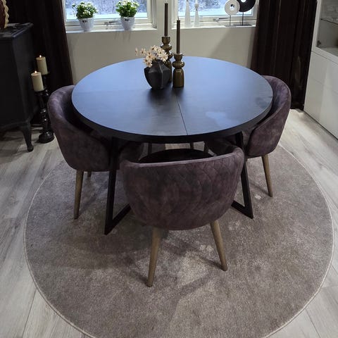 Komplett spisestue for fire personer selges. Rundt kryssord i sort eikefinér (Ø120) med tilhørende stoler i grå velour. Gulvteppe følger med i prisen.