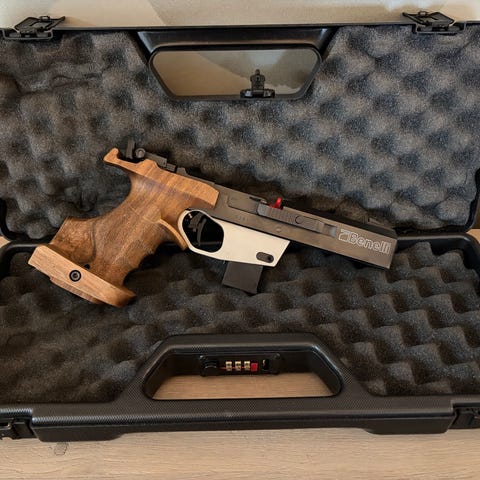 Pent brukt Steyr Sport 814960 cal. 4.5/.177 5 skudds luftpistol selges med koffert. Sylindere er gått ut på dato, men nye kan skaffes mot tillegg i pris/ avtale.