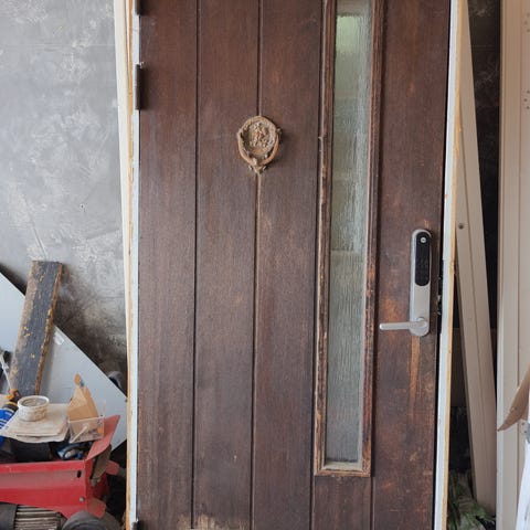 2 stk Innerdør i tre med stort glassfelt i øvre del. Døren har mønstret glass med rutemønster som slipper inn lys samtidig som det skjermer for innsyn. Klassisk, glatt tredør fra 60 tallet