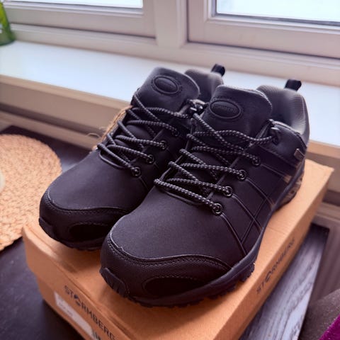 Stormberg tursko i størrelse 40. Skoene er lave og egner seg til fottur og hverdagsbruk. Modellen er svart med snøring og drahempe bak. Overdelen ser ut til å være i syntetisk materiale og tekstil, med forsterkninger i tå- og hælparti. Yttersålen har grovt mønster for bedre grep på variert underlag. Innvendig polstring rundt ankel for økt komfort. Passer til fotturer og annen lett uteaktivitet.