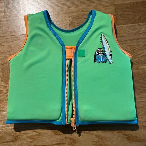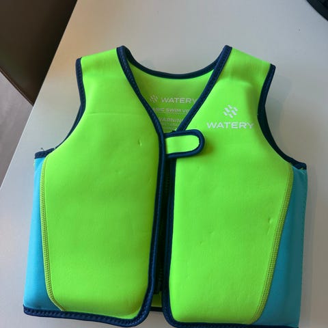 Watery flytevest for barn i grønn farge med mønster. Vesten har flere flyteelementer på innsiden og justerbar stropp nederst for bedre passform. Egnet som støtte ved lek og svømming i vann under oppsyn av voksne. Laget i mykt materiale med kontrastkant rundt åpninger og kanter for økt synlighet i vannet.