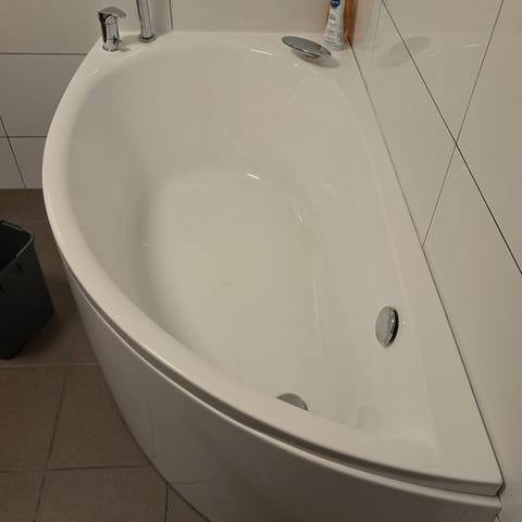 Hjørnebadekar massasjebad i hvit utførelse. Badekaret har flere innebygde massasjedyser langs sidene og i fotenden. Det er integrert armatur med blandebatteri og tut montert på karkanten. Formen er tilpasset montering i hjørne, med avrundet front og rette sider mot vegg. Egnet for baderom med flislagte vegger og gulv der det er tilrettelagt for inn- og utløp av vann samt strømtilkobling til massasjefunksjonene.