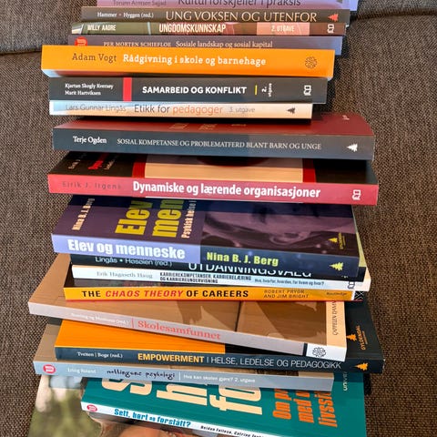 Selger fagbøker fra studier i karriereveiledning og flerkulturellarbeid/konflikthåndtering. Noen av bøkene har anmerkninger gjort med blyant, men ellers er i god stand.