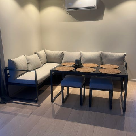 Bordet er svart med gull på beina, stolene er i veluor og er svarte med gullbein.