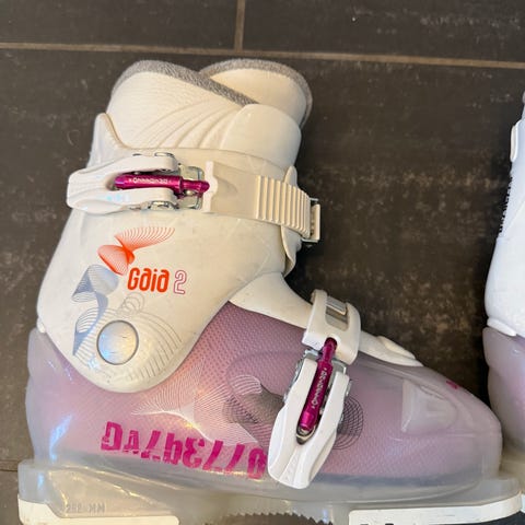 Dalbello Gaia 2 alpinstøvler for barn i hvit med rosa detaljer. Støvlene har to spenner, én øvre justerbar plastspenne og én nedre metallspenne med rosa detaljer. Sålelengde er merket 262 mm. Undersålen har gummierte partier med sklisikkert mønster. Egnet til vanlig alpint bruk for barn som trenger støvler med denne sålelengden.