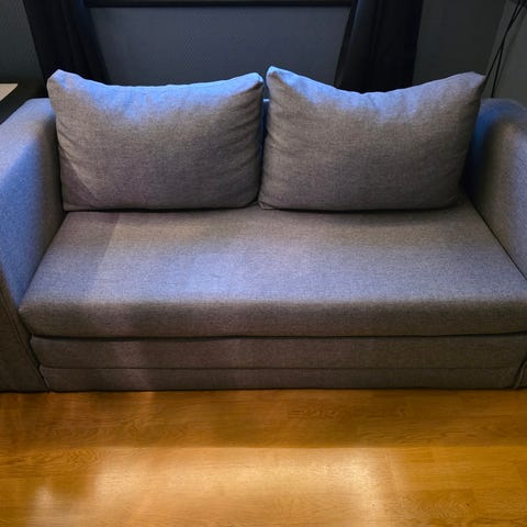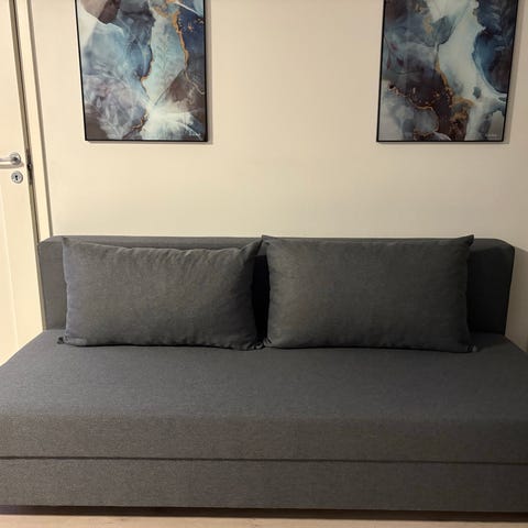 Pent brukt grå sovesofa fra Jysk med eike ben.