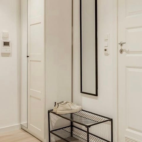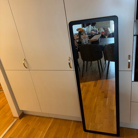 Speil med svart ramme. Kun hengsel til å henge langs lengste siden. Tror man kan skru de av og montere i høyderetning evnt. Jeg har hatt det stående på gulvet.