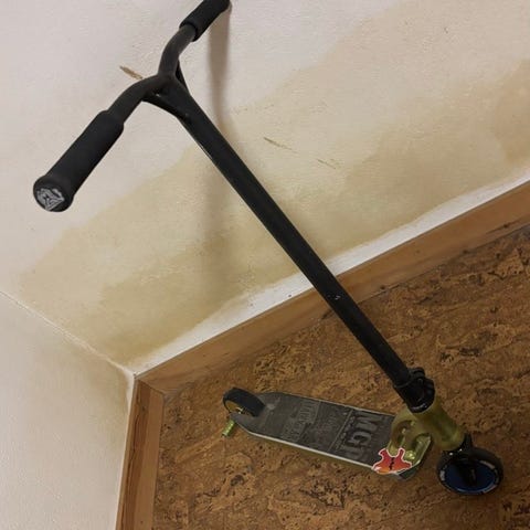 Sparkesykkel triksesparkesykkel i rød og grønn farge. Modellen har T-formet styre, to hjul og lavt ståbrett egnet for triks og kjøring på jevnt underlag. Passer for barn eller ungdom som ønsker en enkel triksesparkesykkel til bruk på asfalt, gårdsplass eller lignende områder.
