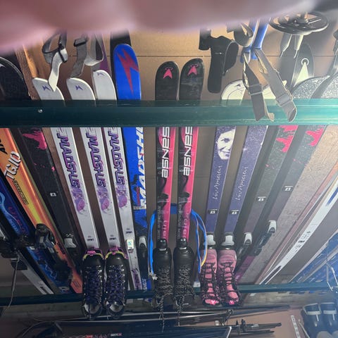 Skiens lengde er 178 cm, og modellen er merket El Rey. Skiene har monterte Marker bindinger (Stepchild System, DIN 3,5–11,5 ifølge merking på skien). POC hjelm og skipose medfølger.
