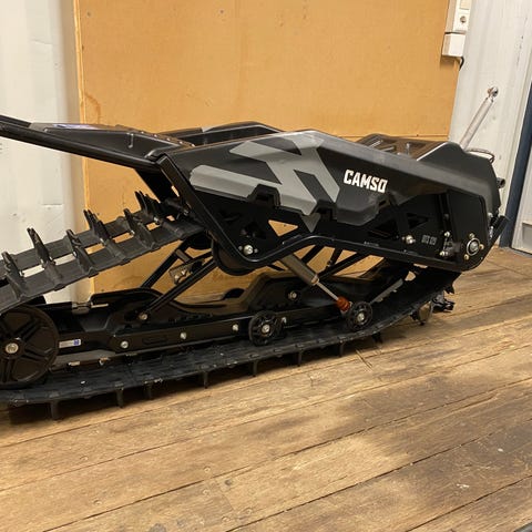 Plass til en 20-liters bensinkanne i stativet foran. Innvendig har den nå en på alle måter hjemmelaget skillevegg og polstring, dette kan selvfølgelig enkelt fjernes om det er ønskelig. Aluminiumskassa festes til ramma med stropper så den er lett å ta av, f.eks. under transport eller om man vil ta den med seg inn på hytta.