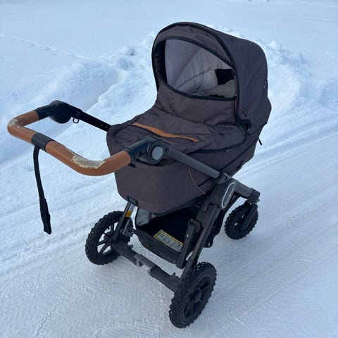 Britax barnevogn med liggedel i beige tekstil. Vognen har sort understell med fire hjul og håndtak med brunt imitert skinn. Liggedelen har hette, avtagbart trekk og madrass. Understellet har romslig varekurv under vognen. Egnet for spedbarn i liggestilling.