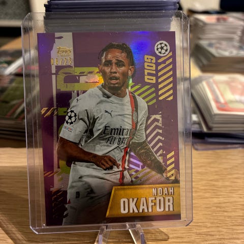 Topps Premier League Amadou Onana samlekort. Kortet viser spilleren i klubbdrakten til Aston Villa, på en holografisk bakgrunn. Kortet er nummerert 10/50.