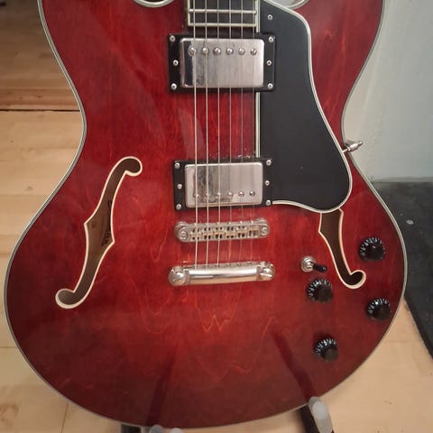 Ibanez Artcore halvakustisk gitar i rød finish. Kroppen er hul med to f-hull og fastmontert hals. Gitaren har to humbucker-pickuper, treveis pickup-bryter, to volumkontroller og to tonekontroller.