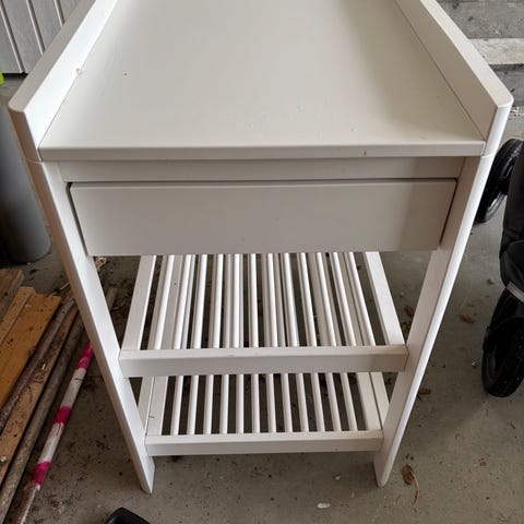 JLY stellebord i hvit utførelse. Stellebordet har en toppflate til stellematte, én skuff foran og to åpne hyller under for oppbevaring av bleier, klær og utstyr. Egnet til bruk på barnerom eller bad der man trenger en fast stelleplass. Utført i et lyst, glatt materiale som er enkelt å tørke av og holde rent.