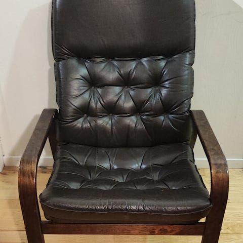 Stolene har ramme i lyst treverk og polstret sete og rygg i svart skinn. Stolene har buede ben og sidevanger som gir lett gyngende komfort. Baksiden har lerretsduk og snøring som holder puten på plass. Passer som ekstra sitteplass i stue, lesehjørne eller TV-krok. Kr 4000 pr stk