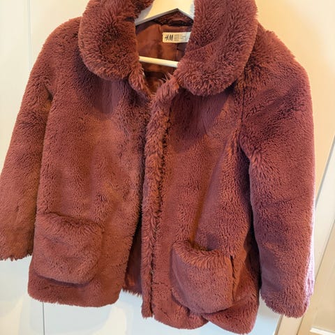 H&M jakke i fuskepels for jente i størrelse 128. Jakken er rosa og har myk, pelslignende overflate. Den har krage, lange ermer og to lommer foran. Innsiden er glattfôret for økt komfort.