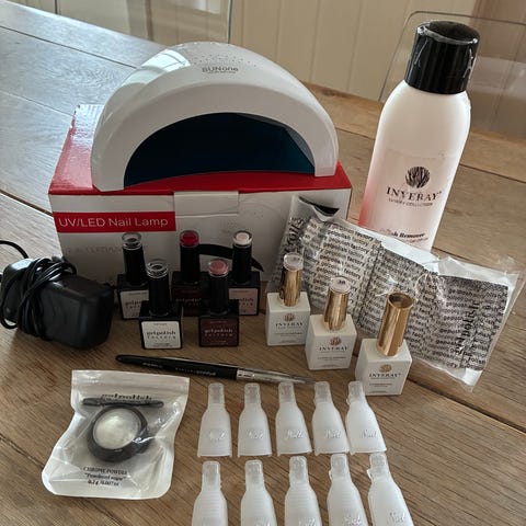 Sett med UV/LED-lampe for herding av gel- og shellac-lakk, samt diverse tilbehør til negledesign. Inneholder blant annet SunUV-lampe med EU-plugg, flere flasker neglelakk/gel-lakk i ulike farger, negledekorasjonssteiner, negleklistremerker, pensler og dotting tools, fil/blokker, kluter, klemmer for fjerning av lakk og beholder for oppbevaring av lakkflasker. Egnet til hjemmebruk for manikyr og negledesign.