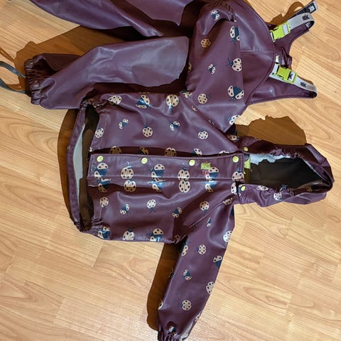 Pent brukt 2 delt regnsett - finner ett par skrapemerker på buksen. Fin, hel og flott dress som holder barnet tørt.