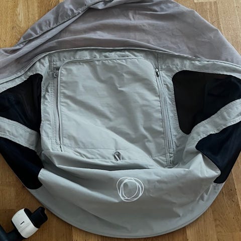 Bugaboo kalesje til barnevogn i grå tekstil. Kalesjen har glidelås og nettingfelt for lufting.