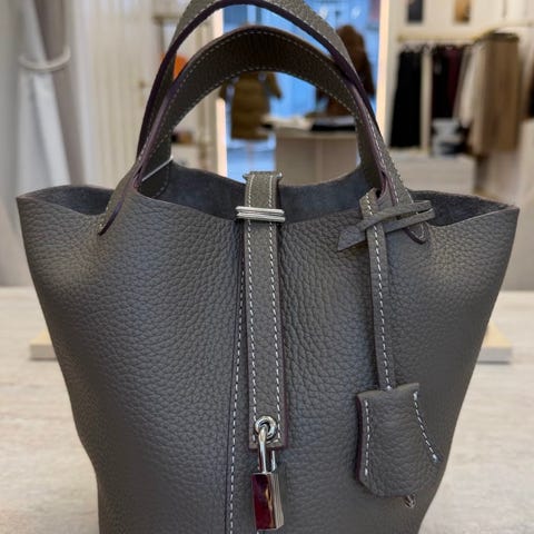 Stor, romslig skinnveske. Lukking med glidelås. Ett rom på hver side med glidelås.