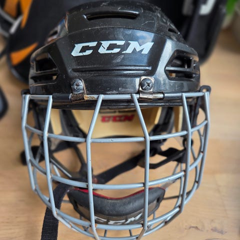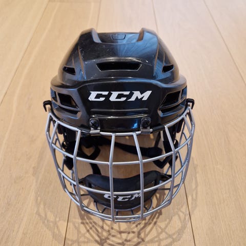 CCM 50 ishockeyhjelm med gitter i størrelse S. Hjelmen er svart med justerbar passform og polstret innside for komfort. Leveres med metallgitter foran for ansiktsbeskyttelse. Sertifisert ishockeyhjelm merket HECC og CE på baksiden frem til 2025. Egnet til ishockey og annen isidrett der hjelm med gitter kreves.