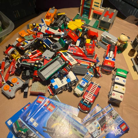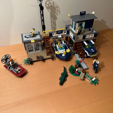 LEGO City byggesett samling. Pakken inneholder flere ulike City-sett med bygninger, kjøretøy og minifigurer. Blant elementene som vises på bildene er politistasjon med kjøretøy og helikopter, rednings- og servicekjøretøy, butikk- og kafébygg, samt natur- og eventyrscener med terreng og helikopter. Det følger også med flere instruksjonshefter til de ulike LEGO City-settene. Innholdet kan brukes til å bygge en variert LEGO City-by med flere miljøer og figurer.