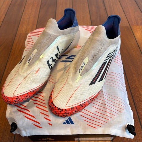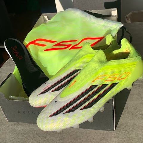 Selger ett par fine Adidas F50 Laceless. (Ag knotter) Disse skoene er kjøpt med knotter tilpasset kunstgress Skoene er i str 41,5. Skoene er godt brukt, men de har fortsatt mye liv igjen i seg. Skoene har fått noe lunde slitasje innsiden av hælen, men dette merkes ikke ved bruk av skoen.