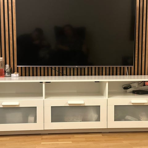 TV-benk i glass og metall. Møbelet har en svart bunnplate, en klar glassplate på toppen og en frostet glasshylle i midten, støttet av sølvfargede metallstolper. Benken har flere hyller som gir plass til TV, medieutstyr og tilbehør. Oppgitte mål på bildene er ca. 140 cm bredde, 50 cm dybde og 180 cm høyde. Passer som TV-møbel eller oppbevaringsløsning i stue eller mediarom.