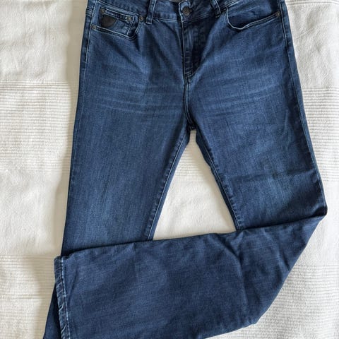 Brukt, men hel og fin. Mye bruk igjen. Noe antydning til slitasje i skrittet. Mørkeblå med myk og behagelig stretch