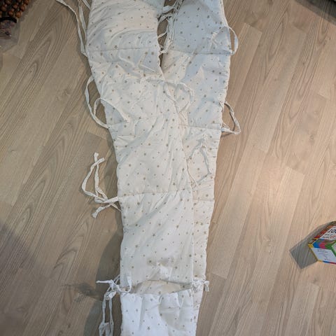 Denne passer perfekt til standard sprinkelsenger, og måler 30 x 360 cm. Den kan imidlertid også tilpasses mindre senger. Festes i sprinklene oppe og nede. Noen av festetrådene har løsnet ved bruk, og er sydd fast igjen for hånd. Ett sted er en av festetrådene erstattet av et grønt og hvitt bomullsbånd.