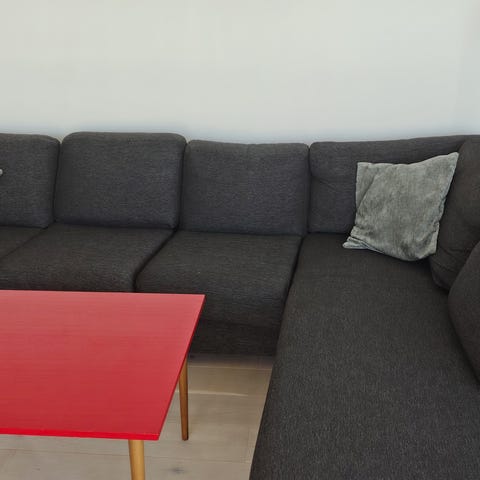 Den har ingen løse deler, og har dun i putene, så den holder fasongen selv med mye sitting. Den er 3 meter lang, og veldig romslig (se siste bilde).
