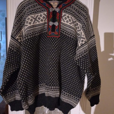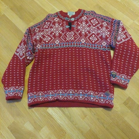 Dale of Norway ullgenser for herre i størrelse XL. Genseren er blå med tradisjonelt mønster over bryst og skuldre, samt sponsorlogomerker foran. Strikket i ull med høy hals og glidelås øverst. Ribbestrikkede mansjetter og linning for bedre passform. Egnet som varm genser til hverdagsbruk eller som mellomlag på kalde dager.